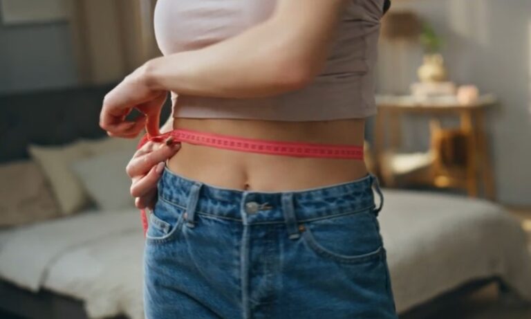 Devojka drži ruke pored stomaka simulirajući ubrzavanje metabolizma
